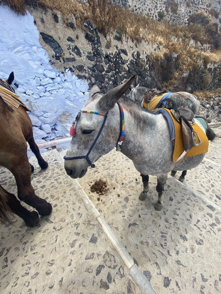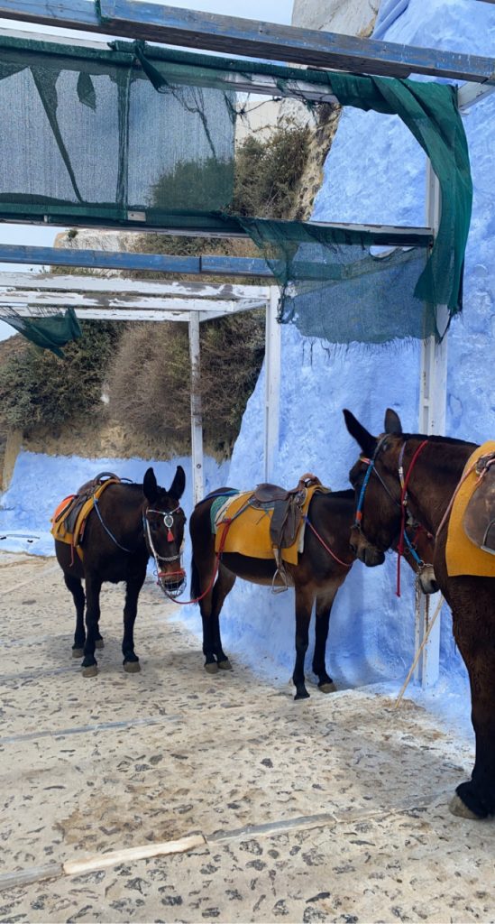 In both Fira and Oia, there are the classic donkey rides. However, these poor animals are walking up and down the hundreds of steps carrying people in the heat all day. But, it you just want to see them – when in Fira, follow the signs to the boat docks. You will see the donkeys all lined up or even walk right past you. It’s not the best smell but we loved dodging the donkeys on the stairs all day.