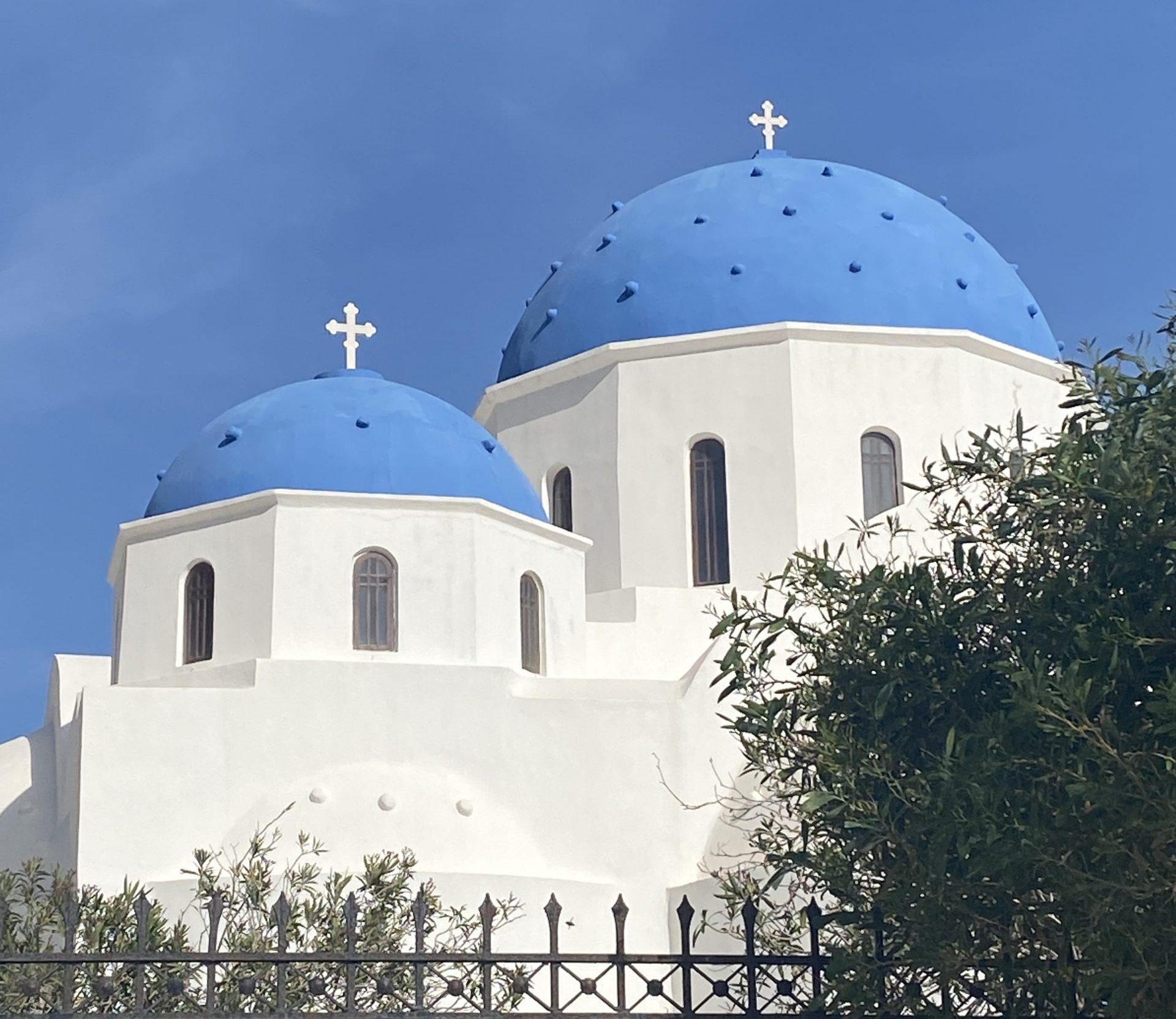 It’s those classic blue and white domes and church bells. This attraction was officially known as The Catholic Church of the Dormition. Easily noticeable if you’re walking through Fira for the day.